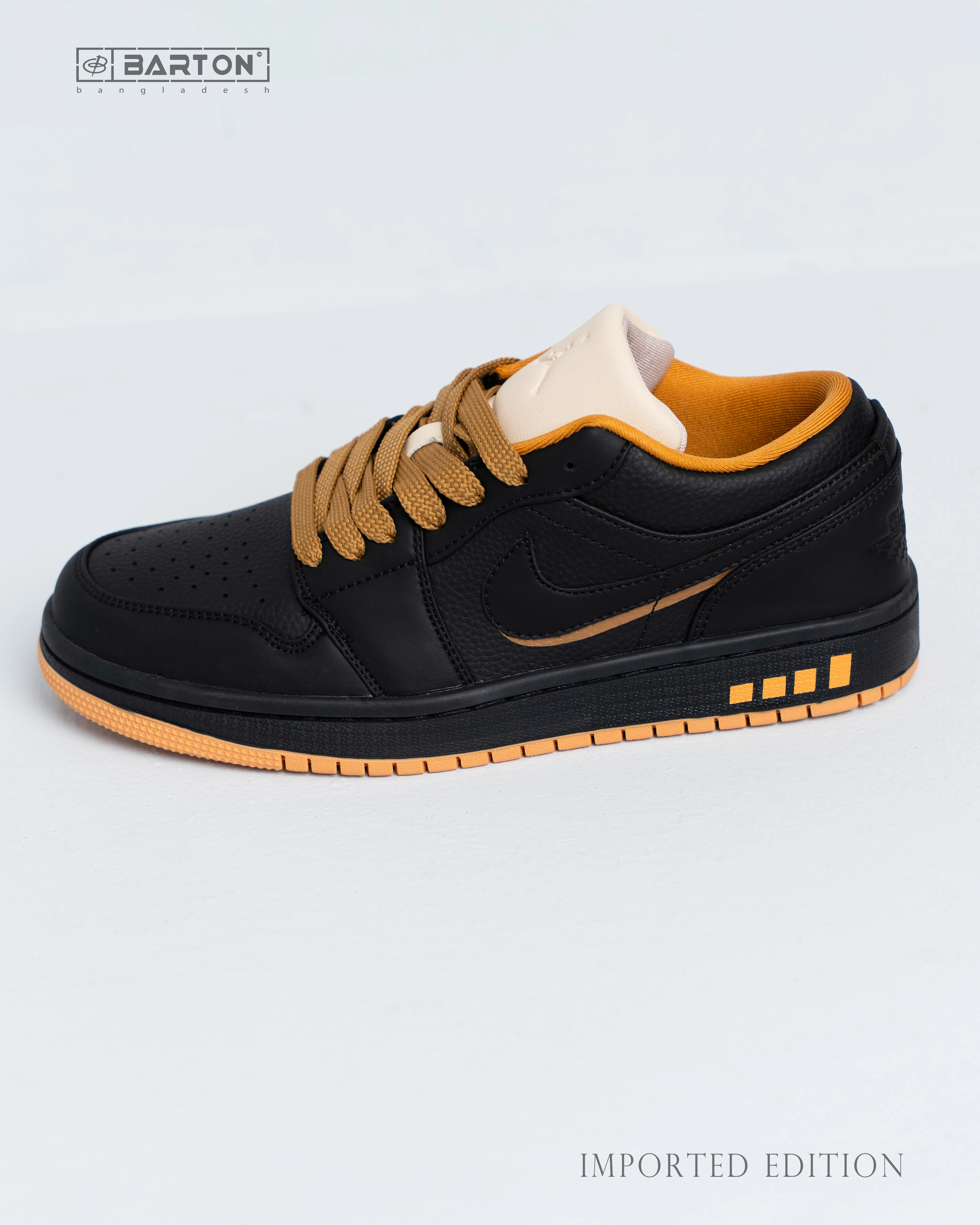 Step up your sneaker game with the Air Jordan 1 Low – Black & Mustard Imported Edition, a perfect blend of timeless Jordan heritage and modern street flair. Crafted from premium genuine leather, this pair offers unmatched comfort and durability. The contrasting mustard accents on the laces, lining, and outsole bring a bold touch to the classic black base, making it a standout in any collection.