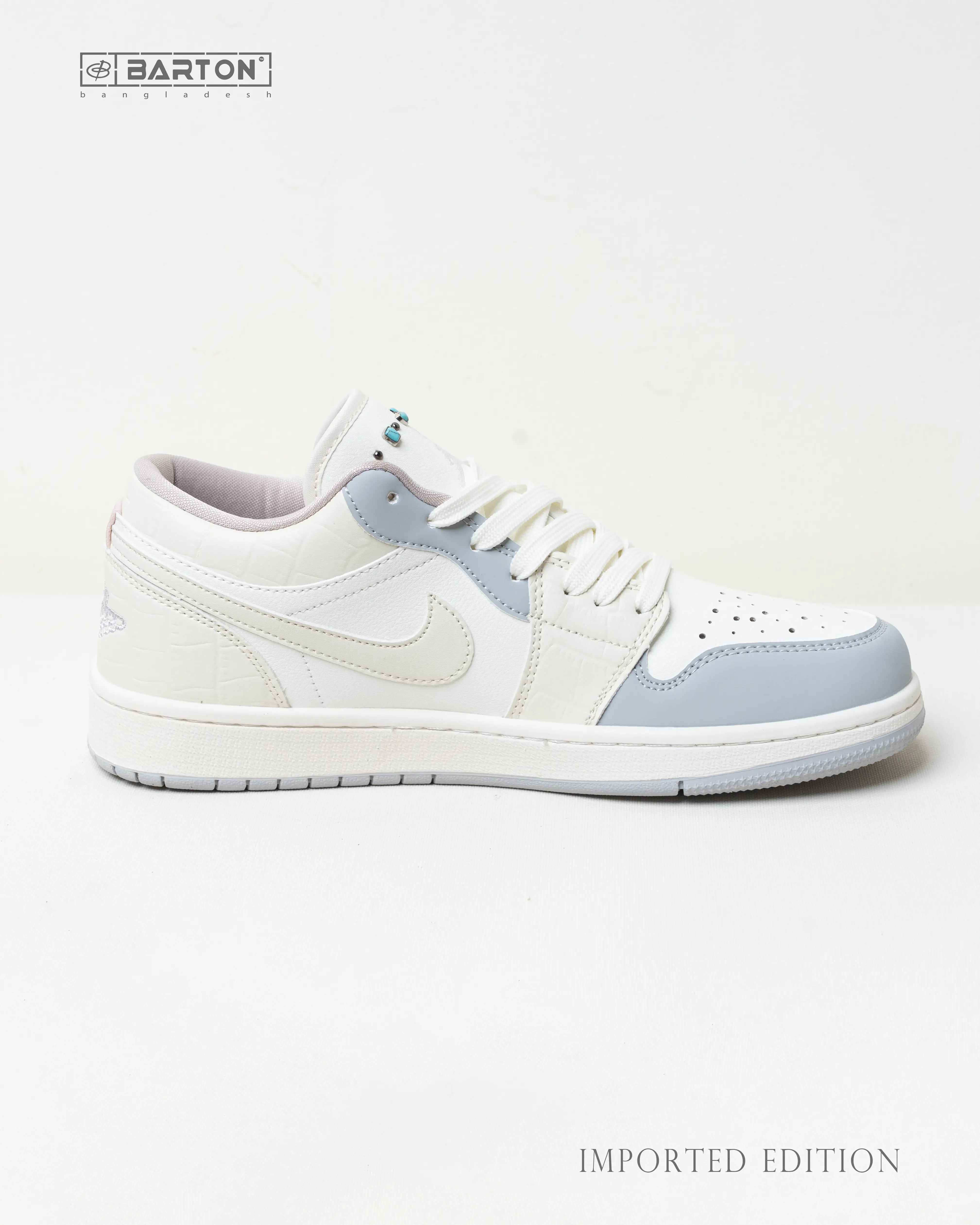 The Air Jordan 1 Low – Stone (Imported Edition) | OM Grade blends a classic silhouette with modern detailing for a standout lifestyle look. Its black-and-white upper is complemented by premium stone accents on the tongue, giving the sneaker a unique and stylish appearance. Crafted with OM-Grade quality, this pair offers enhanced durability, refined finishing, and superior comfort for everyday wear.