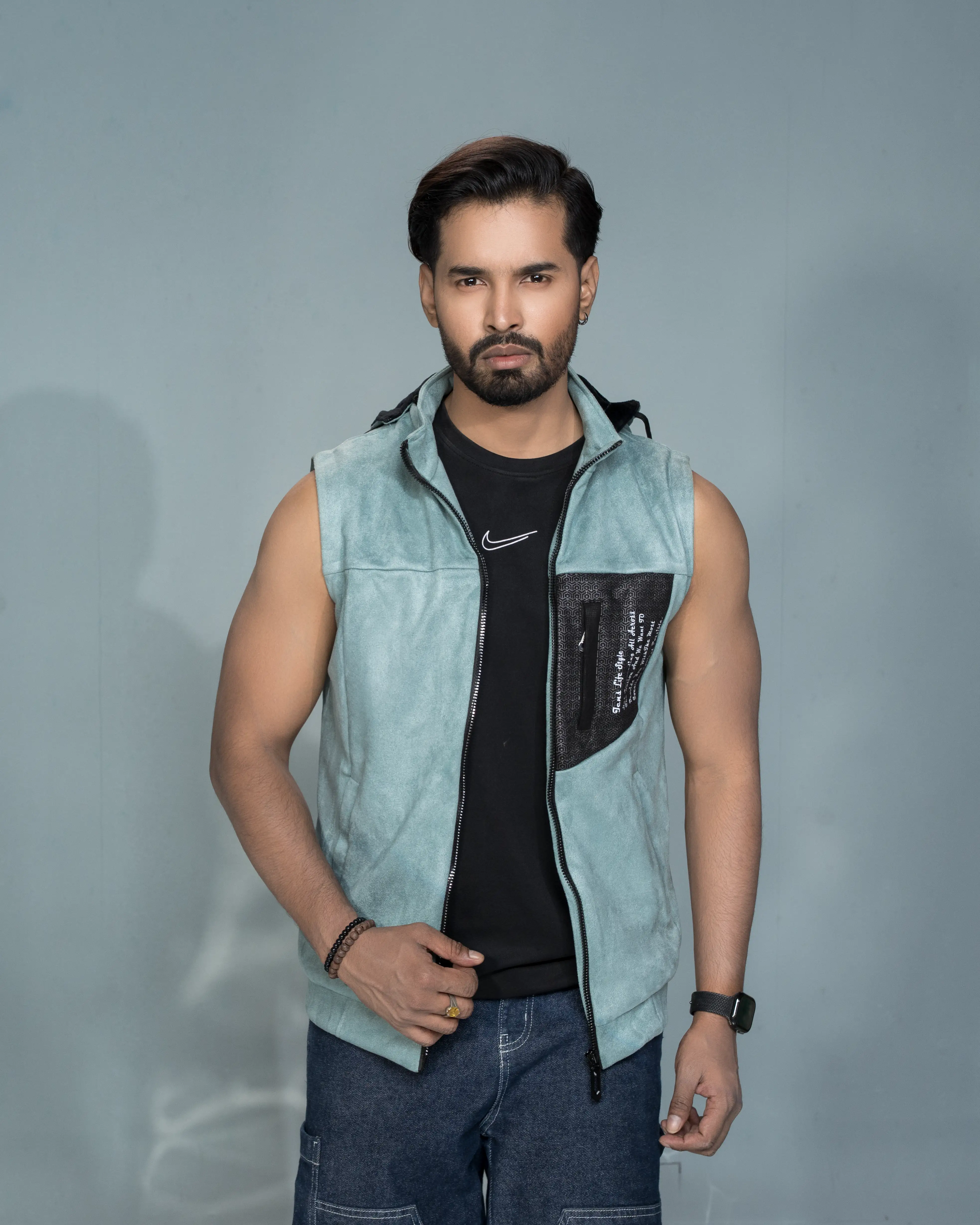 Featuring a full front zipper, adjustable hood, and a contrasting textured chest pocket with graphic detailing, this sleeveless hoodie brings a unique streetwear vibe. The design in the image highlights a clean, sharp look—perfect for gym sessions, layering, or casual everyday wear.