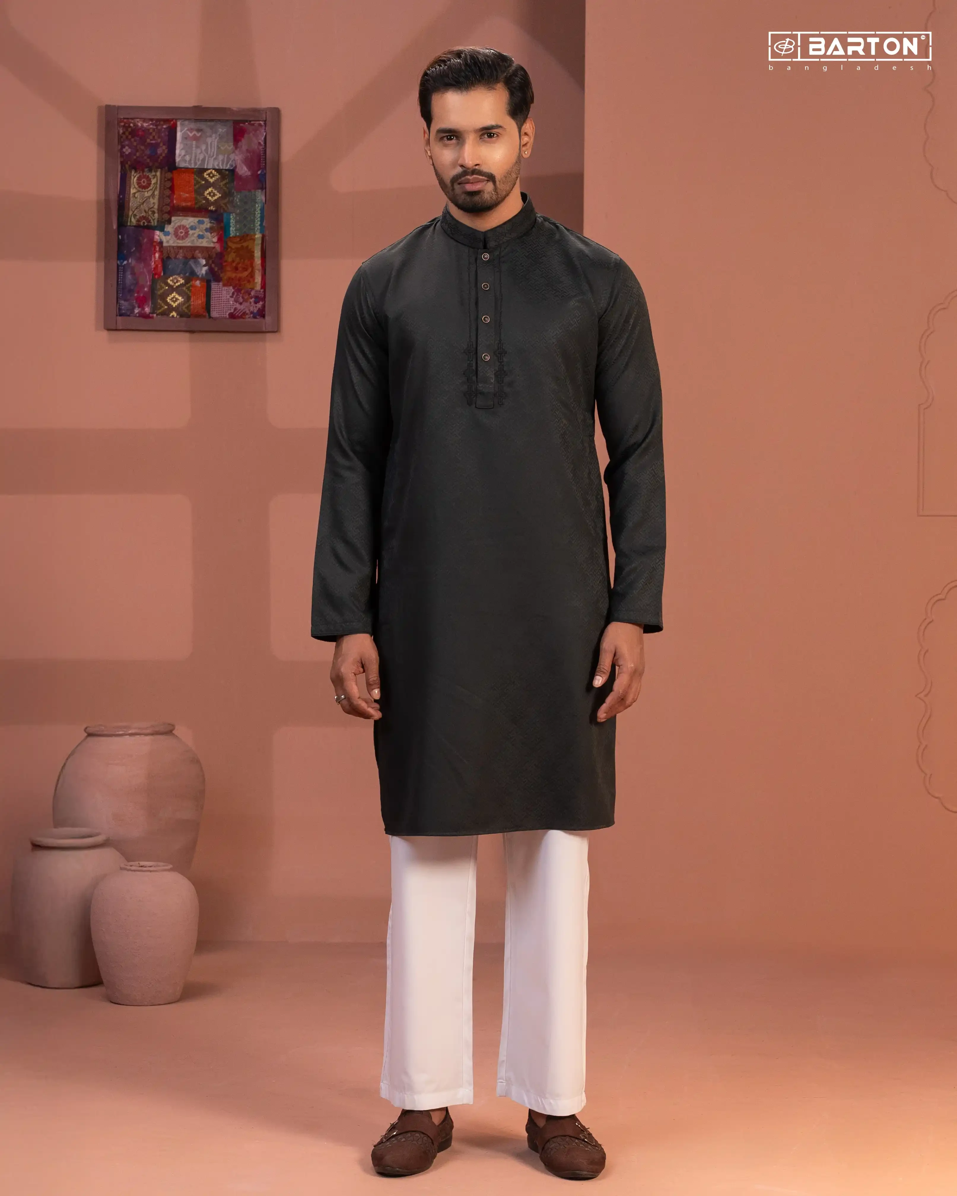 Make a refined statement with this elegant Barton Panjabi, crafted from premium Indian Jacquard fabric known for its rich texture, subtle sheen, and durability. The deep black tone enhances its timeless appeal, while the intricate embroidery on the placket and collar adds a sophisticated traditional touch.