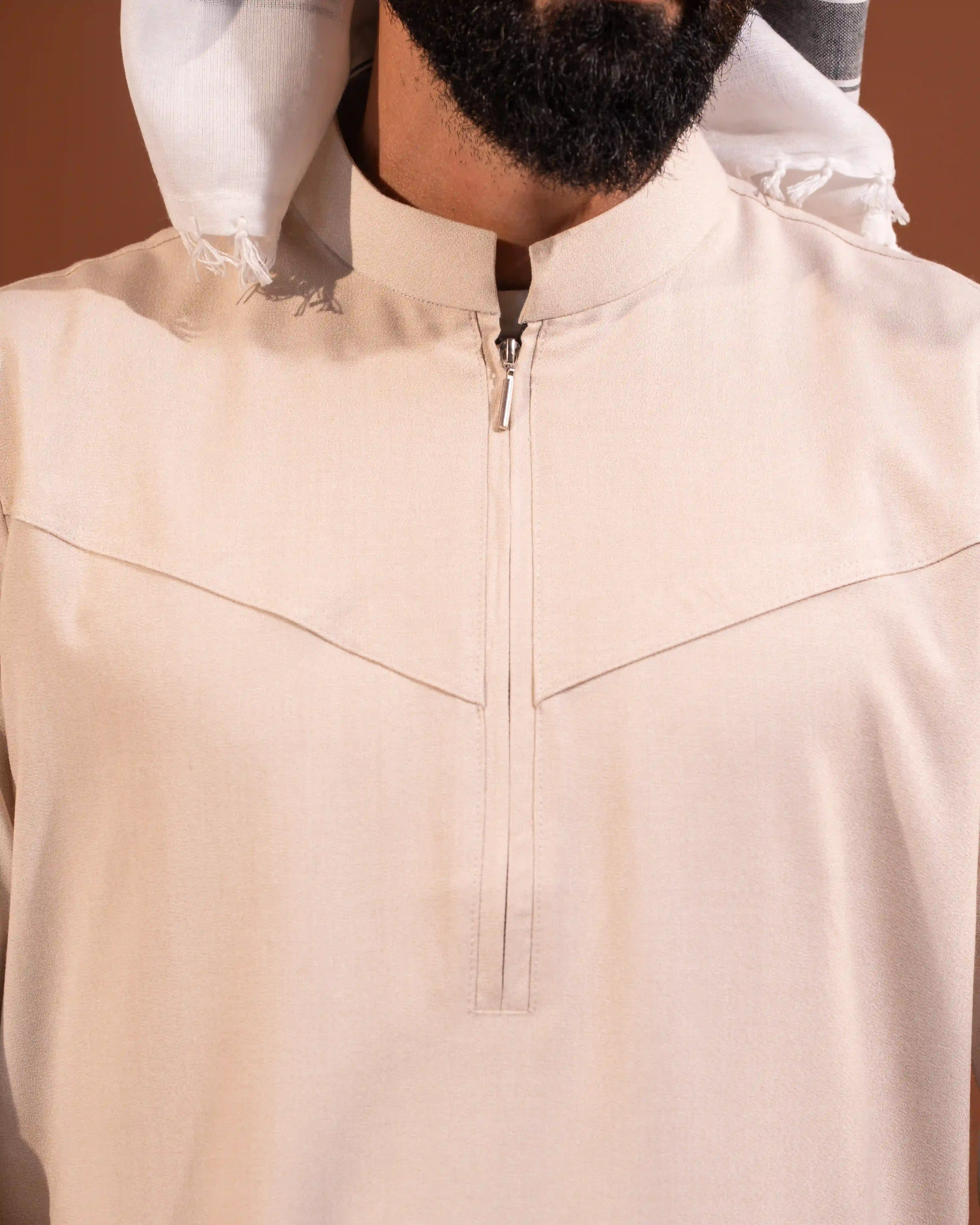 Designed with a modern Venn collar and a smart front zipper closure, this thobe blends classic modesty with contemporary detailing. The structured upper panel adds a sharp silhouette, while the breathable fabric ensures all-day comfort.