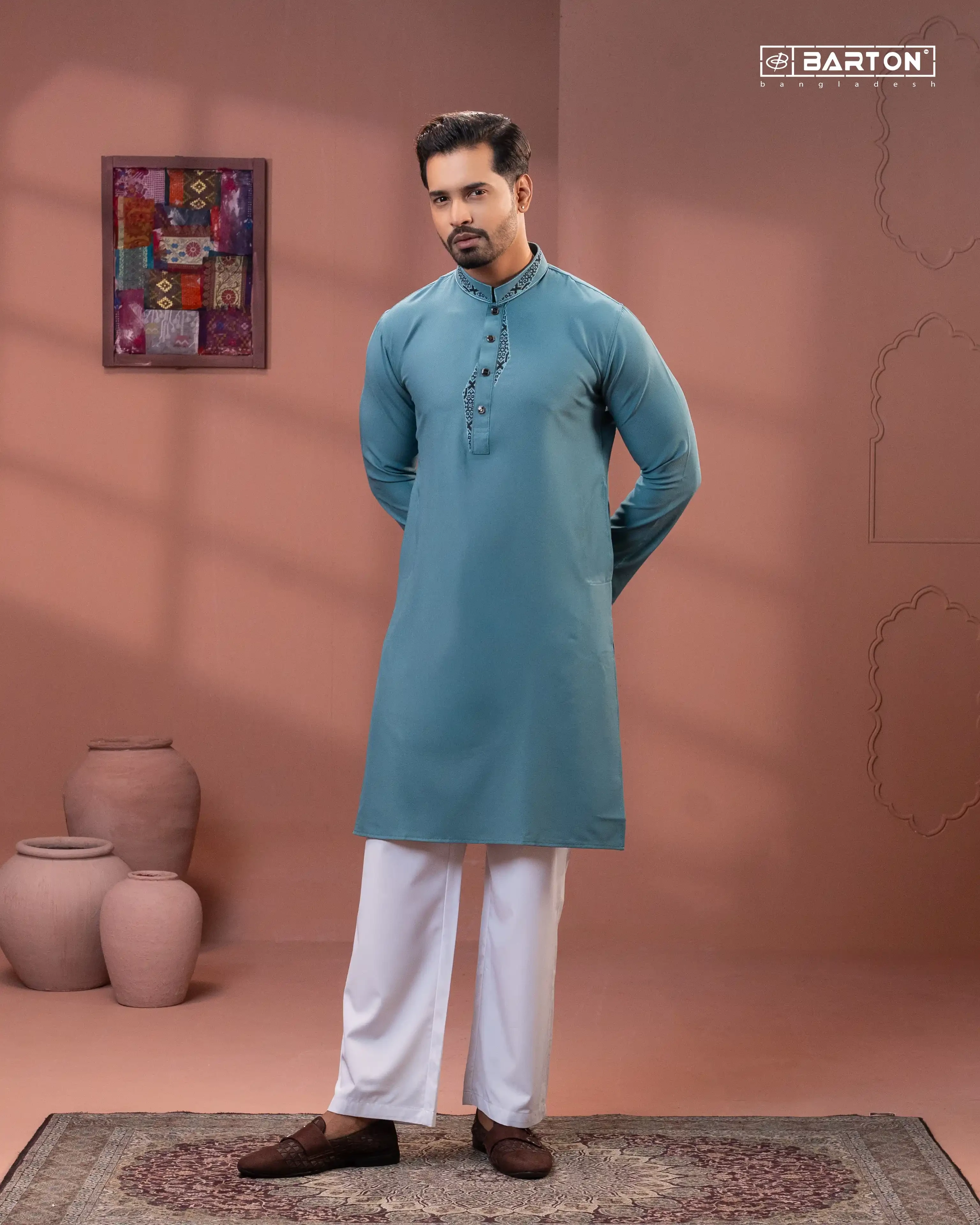 Elevate your traditional style with this refined Barton Panjabi, crafted from premium China Fancy Cross fabric that offers a smooth texture, durability, and comfortable wear throughout the day. The elegant teal tone adds a modern yet timeless appeal, while the subtle embroidery on the placket and collar enhances the overall sophistication.