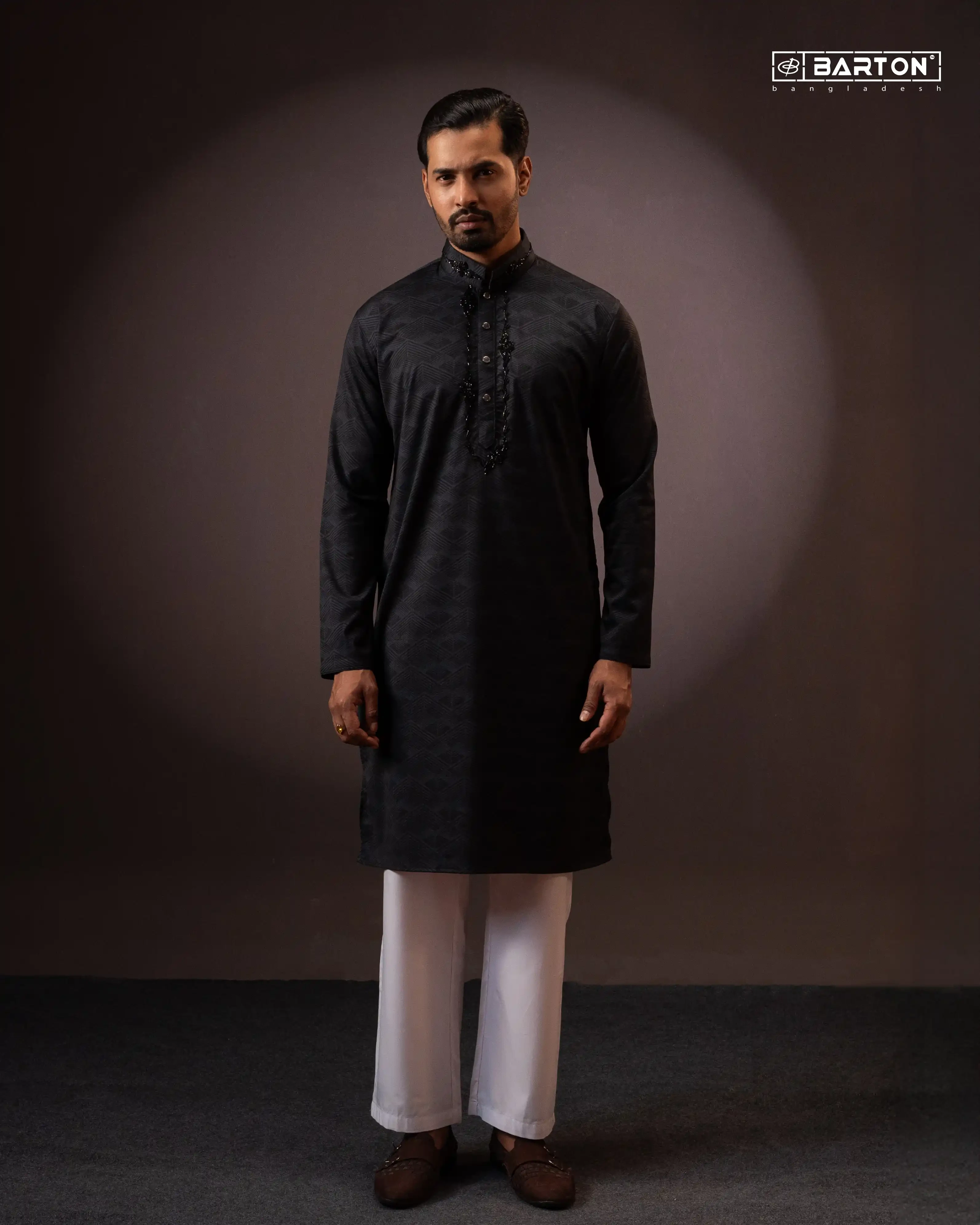 Make a bold and sophisticated statement with this premium Barton Black Panjabi, crafted from high-quality Indian Magnet fabric known for its smooth finish, durability, and comfortable feel. The deep black tone delivers a timeless and elegant look, perfect for refined traditional styling.